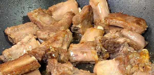 5、接下来就要将排骨煮一会儿了,排骨炒香之后加入开水,要没过排骨该加入适量的料酒以及老抽,然后盖上锅盖,将它用小火炖至45分钟左右。