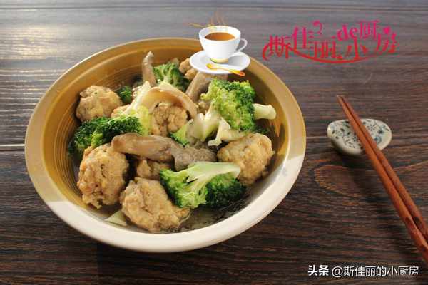 制作: 烧锅水加入少许盐和油, 将西蓝花放入锅中烫变色后捞出; 肉末中加入少许盐、姜末、淀粉、料酒和胡椒粉等调味料, 顺着一个方向搅拌上劲。 将油锅烧热至六、七成熟, 将团好的丸子放进油锅中炸熟后捞出,再大火升高油温, 将熟肉丸放入锅中复炸至金黄后捞出备用。 锅中留少许油,加入准备好的平菇进锅翻炒两下,加入丸子进锅中翻炒两下,加入3勺高汤进锅煮上3分钟,加入西蓝花进锅翻炒两下,再加入适量的盐和胡椒粉调味, 最后加入水淀粉勾芡即可。