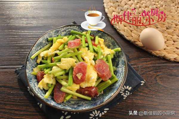 原料: 香肠 鸡蛋 蒜薹 油盐