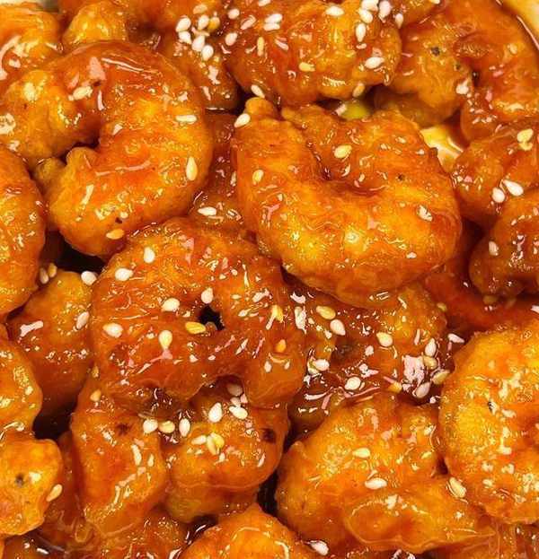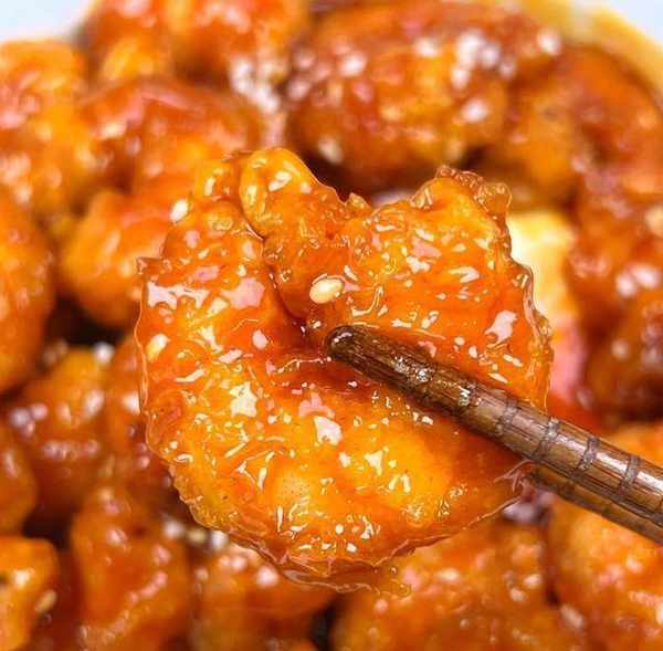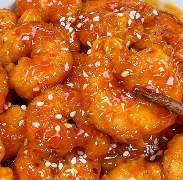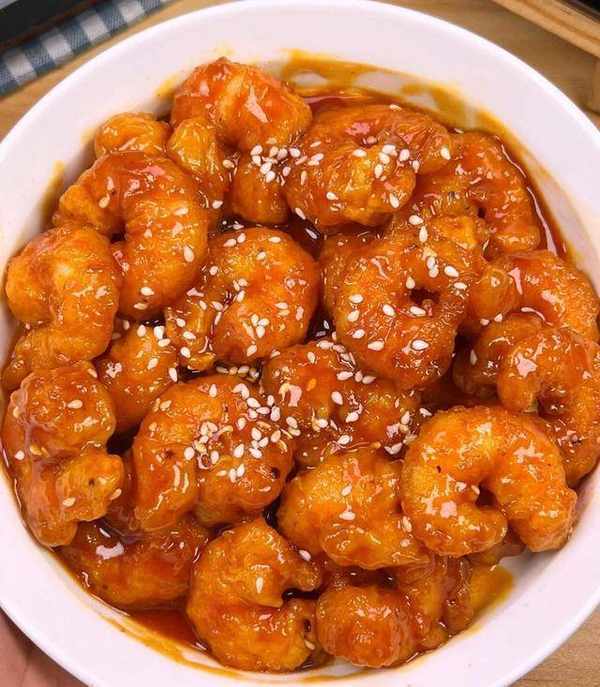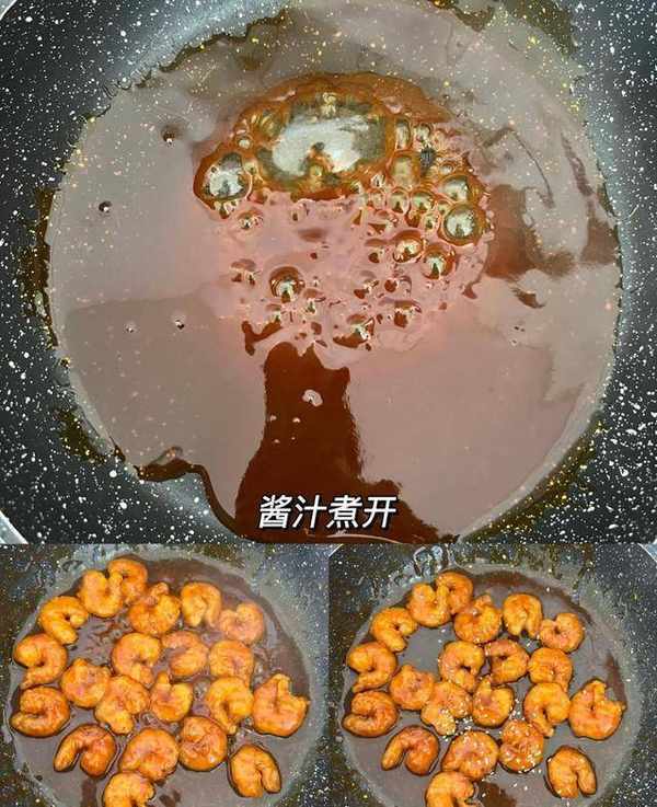 5、锅中留一点底油,倒入酱汁,酱汁煮开倒入炸好的虾仁,大火收汁,撒白芝麻出锅!