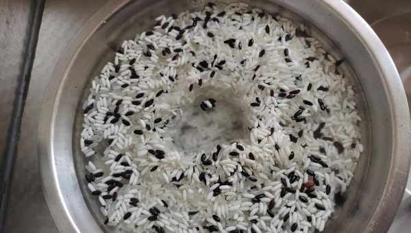 1、把糯米,黑米大分别按照2比1比1的比例浸泡30分钟,然后淘洗干净,用电饭煲开启蒸米饭模式,蒸熟备用。