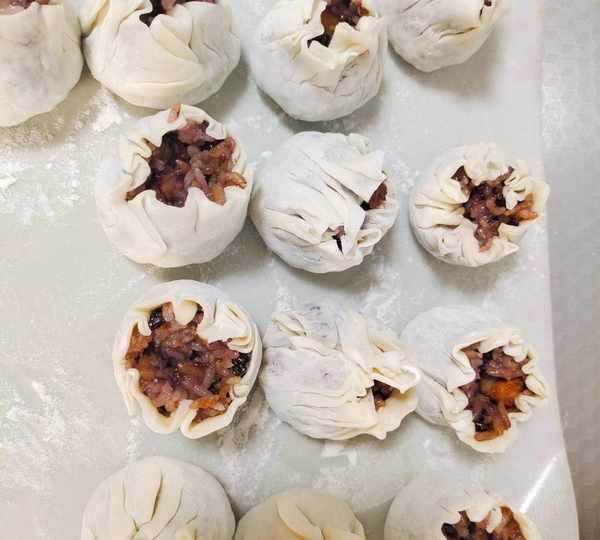3、两块五毛钱,买了25张大饺子皮,用手按压出花型,把馅料放入饺子皮中,用手按压另一只手往里收口,一个烧卖就做好了,