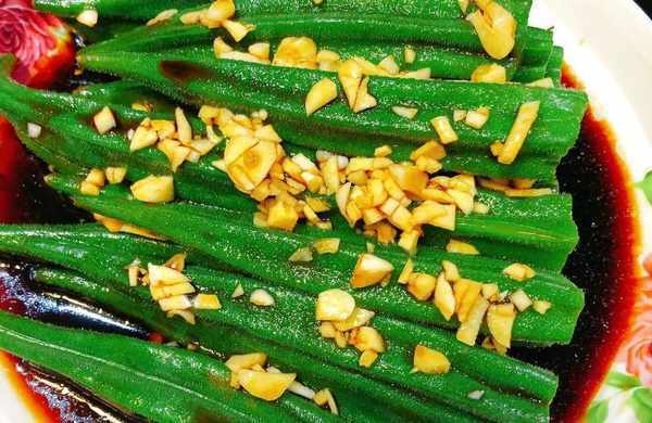 3、碗中放入蒜末,热油激出香味,加入生抽、蚝油、香醋、香油、白糖,食盐搅拌均匀,倒在秋葵上,搅拌下就可以开吃了。