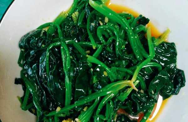 准备食材配料:菠菜、大蒜、生姜、干辣椒、花椒、香醋、香油、生抽