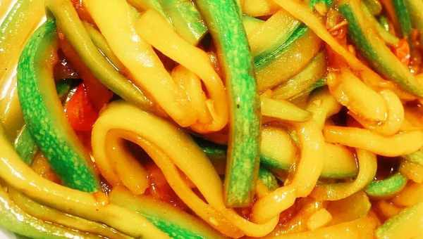 5、起锅烧油,放入蒜末和小米椒爆香,然后放入西葫芦丝,翻炒干水分,最后放入调好的料汁,翻炒均匀后再加入一点香醋,香油,翻炒均匀后即可出锅。