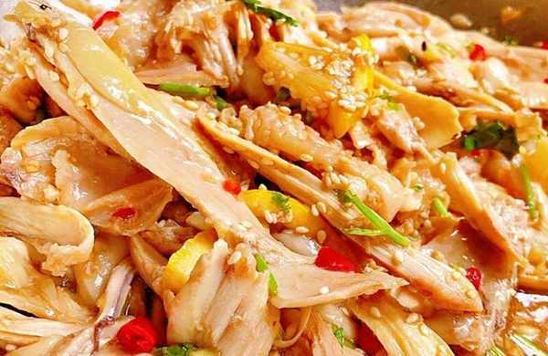 4、全部配料一起倒入鸡丝中用手抓拌均匀即可。