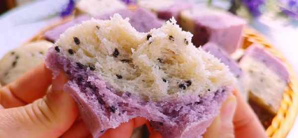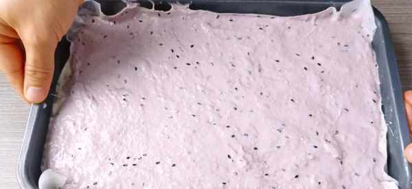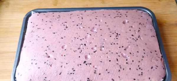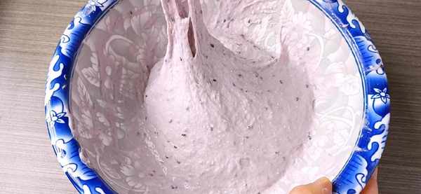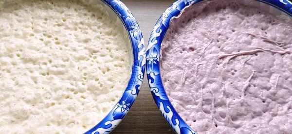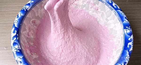 4,往另一只碗中要200g面粉,100g木薯淀粉,再加3g无铝泡打粉,3g酵母,30g白糖、15g紫薯粉,搅拌均匀。倒入280ml的梨子汁,搅拌成粘稠糊状。盖上一层保鲜膜醒发。