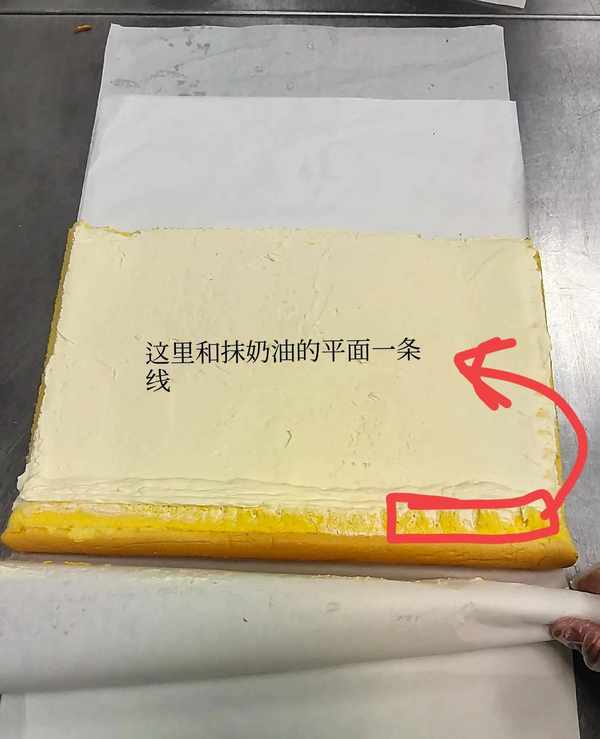 接着第2步,我们将适量的奶油放上去,我在这里面放的是两百克的奶油。喜欢奶油的可以多放一点的就不要太多,不然等我卷的时候呢,会直接被挤到外面来,非常的不好看。
