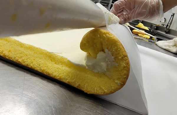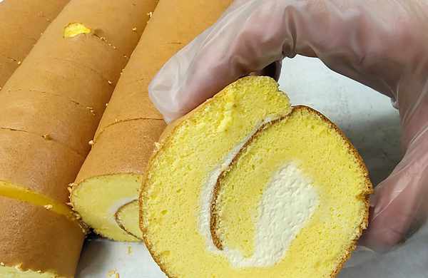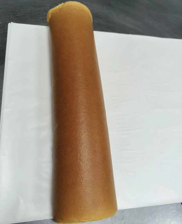 这是卷好之后的样子,然后这种单发卷呢是需要保留外皮的。做普通的蛋糕卷的话,也就是翻面反过来卷就可以了。