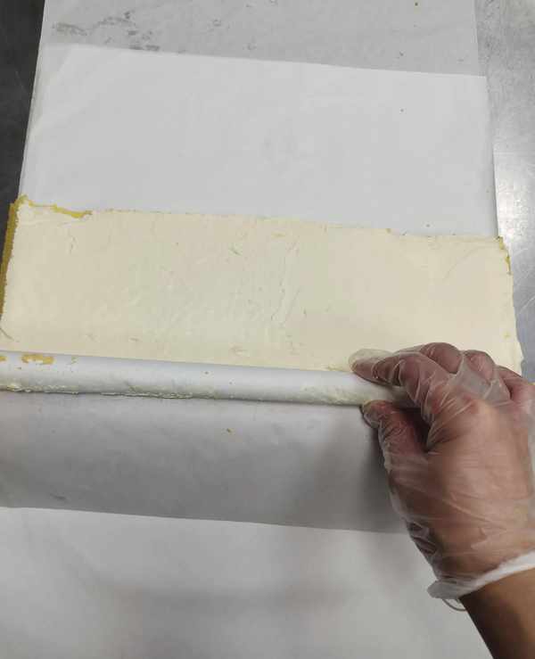 卷好的蛋糕,卷呢两边会比较丑,这个时候不用担心,因为等会我们都是要切掉的,我们把卷好的蛋糕卷连着纸包着一起送到冰箱去冷冻,大概冷冻个二三十分钟或者10多分钟的样子就可以拿出来切了。