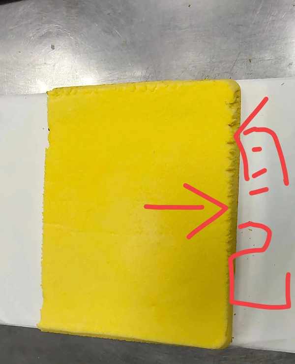 首先第1步,我们先将我们的蛋糕胚放在烤盘纸上。嗯,平时的话这里大家就将那一面深色的那一面朝外。蛋糕平滑的那一面朝向自己