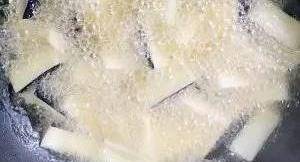2、开油锅,油温七成热下入茄子(炸茄子注意不要被油溅到,本人深有体会),炸到茄子变软迅速捞出