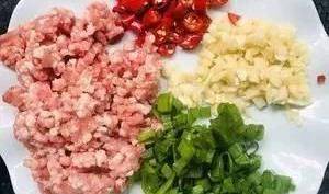 3、锅内刷洗干净放入底油(底油不要太多,因为茄子中已经含有油分),下入蒜泥、杭椒粒煸炒出香味