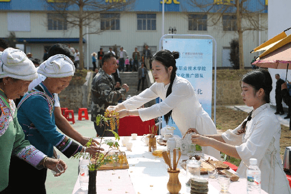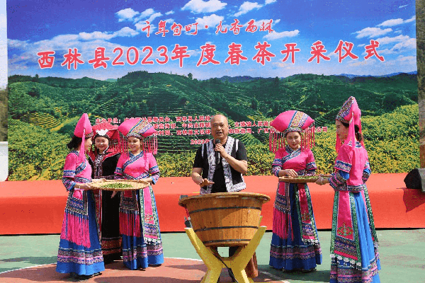 开采仪式上,“好日子”“欧贵”“茶山歌”等别具西林特色的歌舞表演让嘉宾们大饱眼福,广西职业技术学院茶叶大师梁志海带来的炒茶技艺展示将活动推向高潮。舞台上,茶叶大师与嘉宾互动,介绍手工炒茶工艺;舞台下,茶专业学生展示茶艺,将制作的“广职红”“广职绿”及六堡茶等茶饮让观众品尝,共同营造茶香四溢的会场氛围。