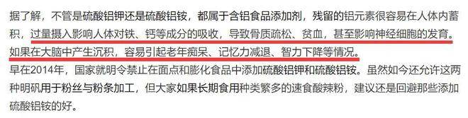 但其实,硫酸铝铵属于含铝食品添加剂,过多摄入会影响人体对铁、钙等成分的吸收,进而导致骨质疏松、贫血,甚至影响神经细胞的发育。