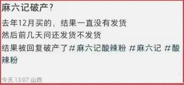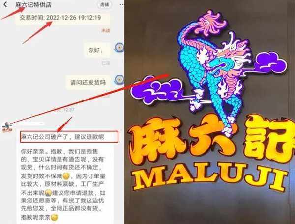 有网友前去询问线上网店,什么时候可以发货,对方崩溃回答:“麻六记公司破产了,建议退款呢!”
