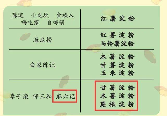 从食安网公布的测评内容中可以看出,豫道、小龙坎、食族人、嗨吃家和自嗨锅,这5种用的是纯红薯淀粉。