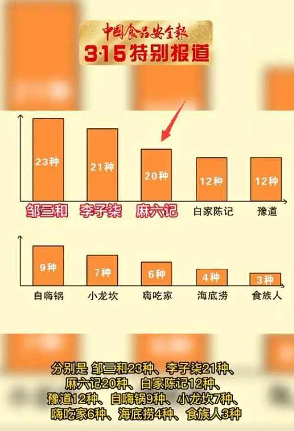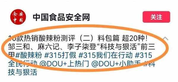 3月15日,中国食品安全网针对10款热销酸辣粉做了测评,麻六记酸辣粉直接登顶“科技与狠活”的前三甲。