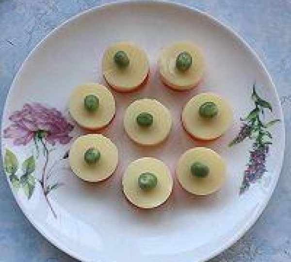 第2步、胡萝卜打皮切厚片,豆腐锋利的刀一切(包装袋)挤出豆腐切厚片放胡萝卜上,放豌豆粒,(最好煮熟的,豆腐好熟)。