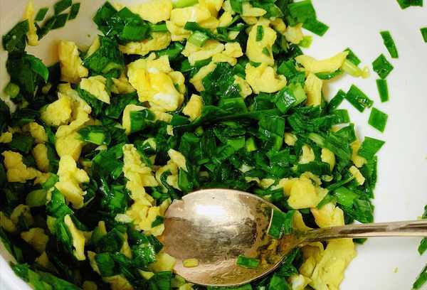 1、过了整个冬天,立春后的第一道韭菜,味道鲜美无比,营养价值也很高。韭菜洗净,控水,煎两个鸡蛋,拌匀调味。盐、香油、五香粉、蚝油,拌匀。