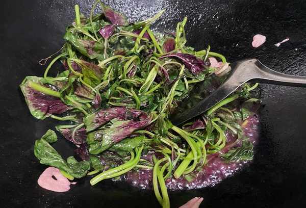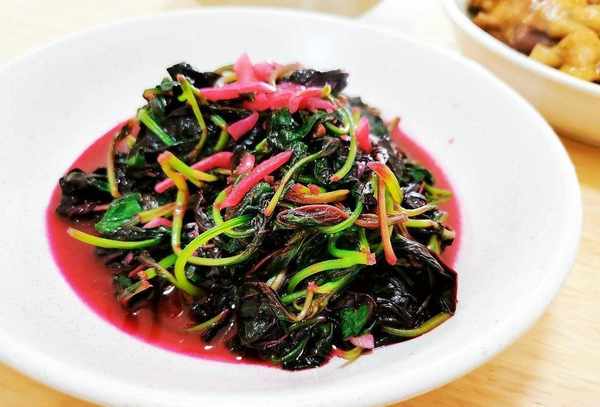 2、锅里放油烧热,将切好的大蒜倒入热油中用文火煮出香味,然后立即倒入苋菜,大火翻炒,苋菜烧热后,会流出少许红色的汤汁。哇,这很正常,石锅拌饭最好吃完,用生抽,盐,鸡精调味。