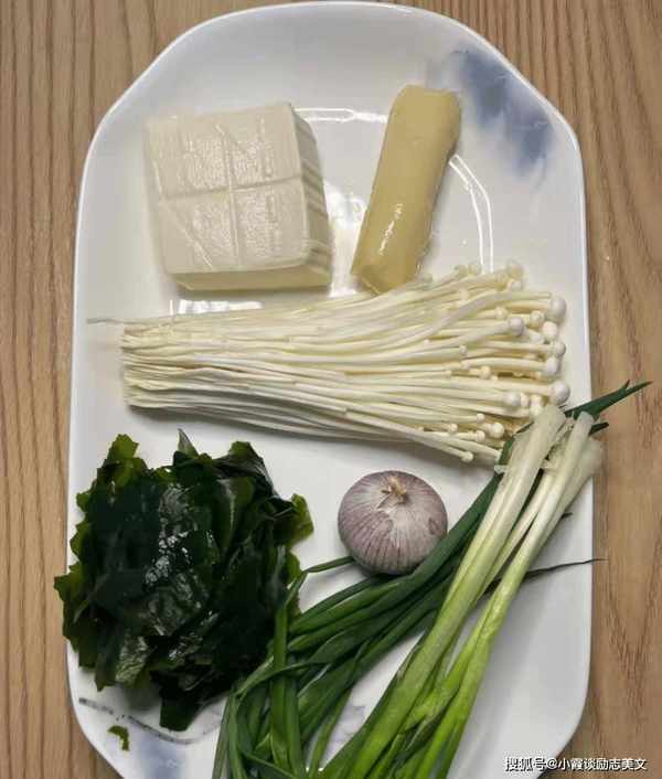 配料明细:买日本豆腐120克,嫩豆腐一小块,裙带菜50克左右,优质金针菇200克(金针菇是一种分布广泛的蘑菇,金针菇鲜嫩,蘑菇香浓爽滑滋润,可凉拌或拌炒食用,也可做金针菇汤),买几根小葱,几瓣蒜,少许食用油,一盒浓汤,少许盐,花椒少许,生抽一勺,蚝油一勺,零食多一些。