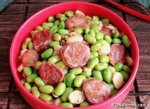 然后倒入豌豆继续翻炒,炒到豌豆变色,再倒入一勺黄豆酱翻炒均匀。