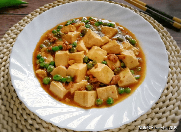 豌豆去掉外皮,剥好后冲洗干净,沥干水分。豆腐冲洗一下,切成小丁待用。蒜末、姜末准备好。