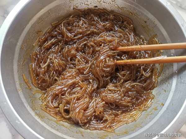 第二步:把红薯粉条煮熟捞出过冷水,沥干水分剁碎,加入蚝油和老抽拌匀上色,在加上一点花生油防止粘连。