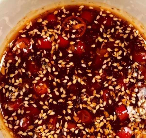 第二步,调制酱汁:碗里倒入蒜末,小米辣,辣椒粉,白芝麻,浇热油适量,两勺生抽,两勺陈醋,少量蚝油,拌匀即可。