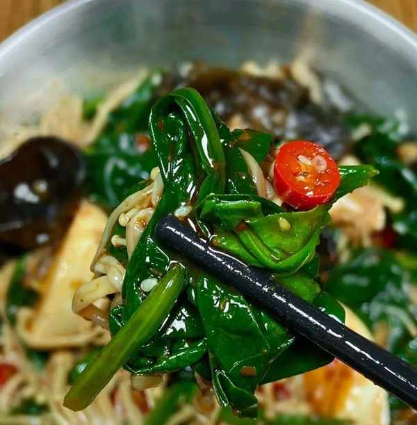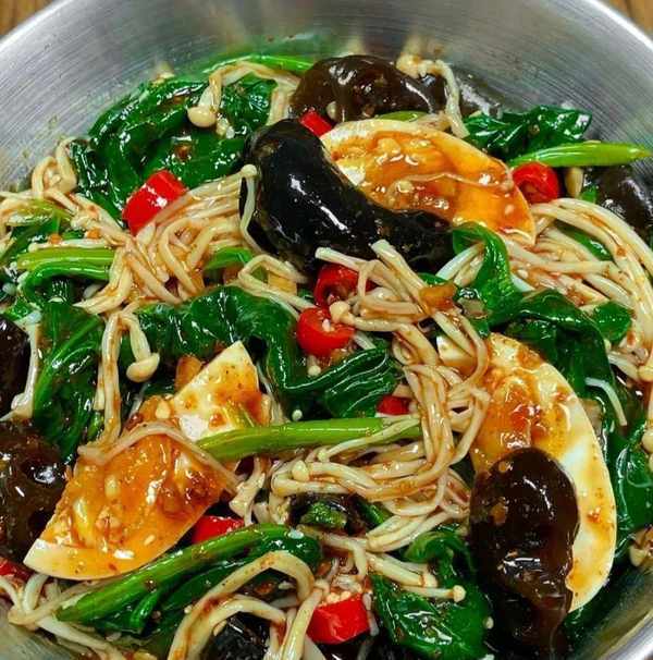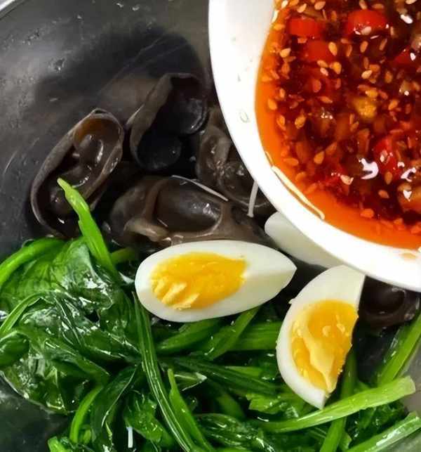 食材:菠菜,金针菇,木耳,鸡蛋,蒜末,小米辣,辣椒面,白芝麻,生抽,陈醋,蚝油,香油