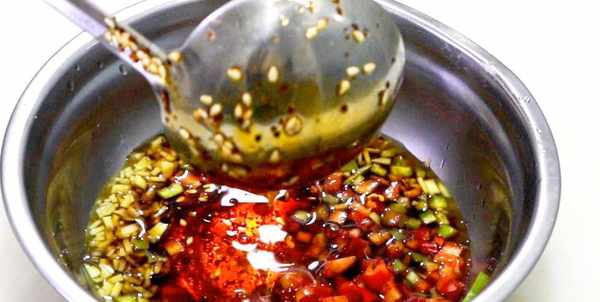 3.盆里加入食盐1克,白糖1克,味精水5克,生抽5克,陈醋8克,香醋3克,红油8克,葱油3克,香油3克,搅拌均匀,化开调料备用。