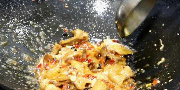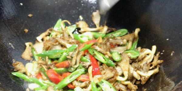 3.锅内留少许底油,放入葱蒜和辣椒爆香,加入蚝油3克,翻炒化开,倒入平菇和青红椒,快速翻炒片刻,开始调味。
