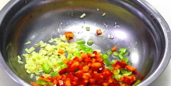 2,生姜一小块切成姜末,青椒半个切成粒,和姜末放在一起,红椒半个同样切成红椒粒,一起放入盆中,用来配色。