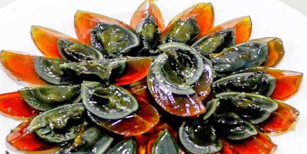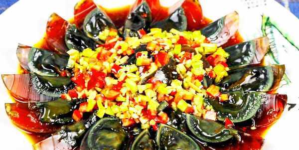 4.然后把调料均匀地浇在切好的皮蛋上面,就可以端上桌食用了。