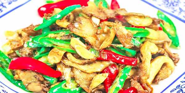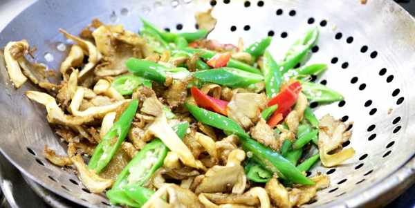 2.炒锅烧热添入食用油,油温五成热时下入平菇,用勺子推动几下,大火炸4分钟左右,炸至平菇金黄酥脆时,下入青红椒,滑油10秒钟,倒出控油。