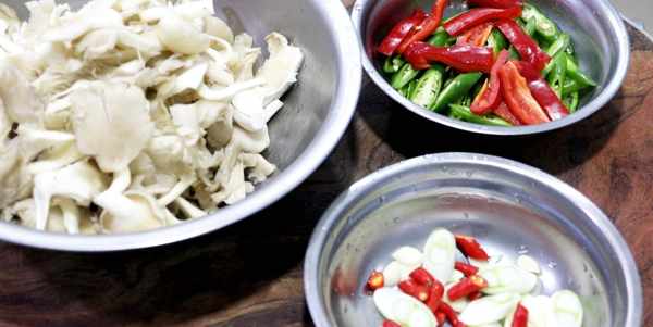 1.准备平菇一斤左右,撕成小片,放入盆中加入清水和一勺食盐,洗净后挤干水分,青线椒一把切成斜片,红椒半片切成段,大蒜切成蒜片,大葱切成马蹄片,小米椒3个切成段,一起放入盆中。