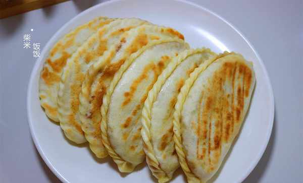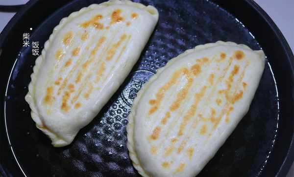 8,不需要等待醒发。电饼铛预热刷油,取最先做好的馅饼放入锅中,饼的表面也刷点油。如果怕不好烙熟,锅里可以淋少许清水。盖上盖子,将饼烙至两面金黄就可以了。