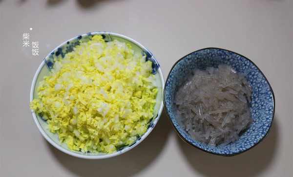 2,粉条提前用温水泡发,切碎。白菜洗净,剁碎。因为搭配了粉条,而白菜也大部分用的白菜叶,所以白菜不需要去水了。