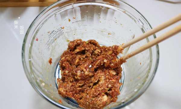 1,猪肉洗净,绞成肉馅。加葱姜、老抽、生抽、花椒粉,沿着一个方向充分拌匀。