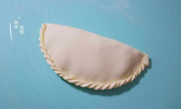 7,对折把封口处按压严实。再沿着封口的位置捏上花边,这样一个馅饼就包好了。将所有的馅饼全部包好。