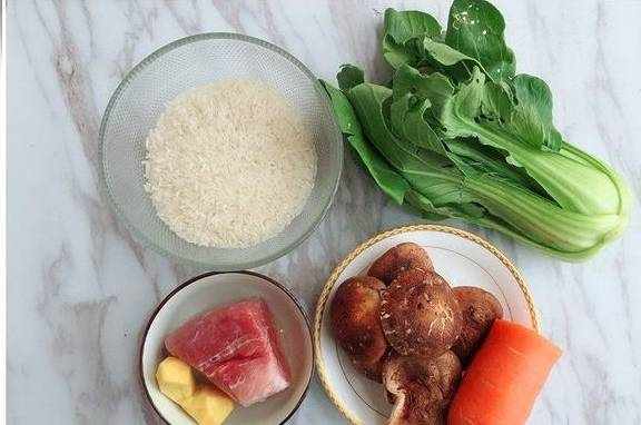 主食材:大米半碗、上海青1颗、香菇6朵、胡萝卜适量、瘦肉100g