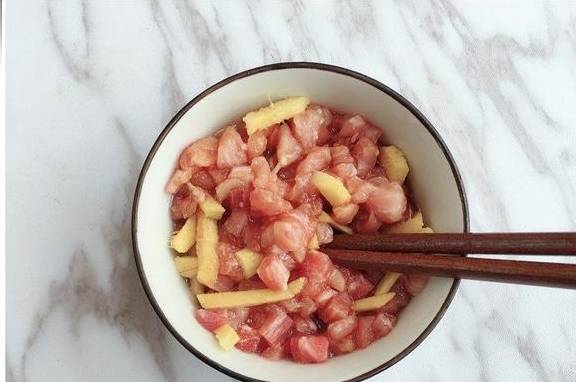 二、瘦肉洗净切末,用姜丝、料酒、酱油、盐油少许将其腌制15分钟备用;