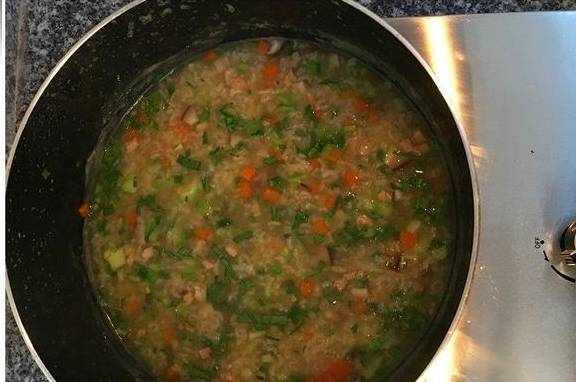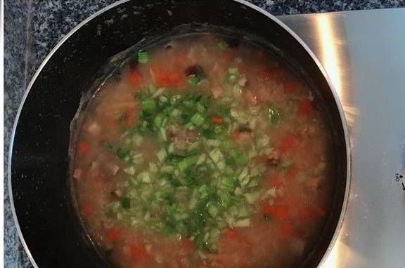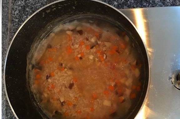 六、随后倒入切好的香菇、胡萝卜,煮开后转小火熬煮;