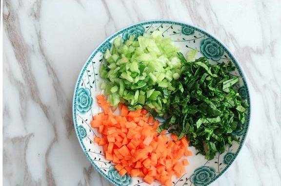 四、胡萝卜洗净切粒,上海青洗净切末,分开放置;
