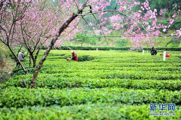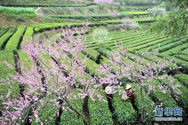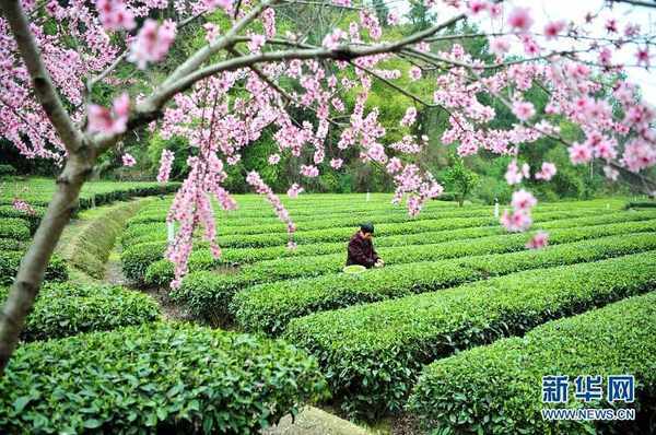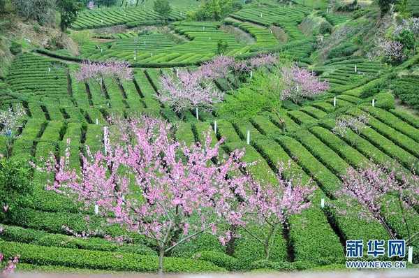 近日来,在湖北省宜昌市夷陵区太平溪镇,生态茶园里的茶树整齐排列,株株翠绿饱满,桃树花开满枝,好似粉色云霞,处处呈现出美丽的乡村田园风景。