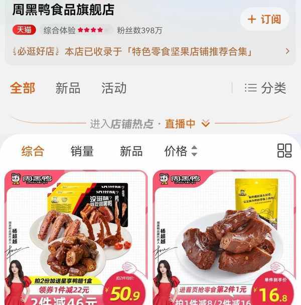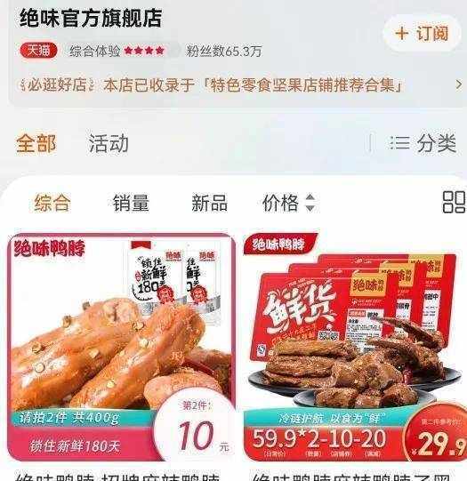 从电商平台淘宝两家产品受欢迎程度来看,绝味食品粉丝65万多,周黑鸭398万,从这个渠道看喜欢吃吃周黑鸭比绝味多,所以这局周黑鸭搬回一局。