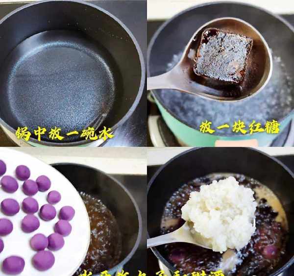 2、接着准备半锅清水,放一块红糖煮化。再倒入做好的紫薯小丸子,然后放入一勺甜米酒。