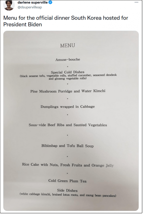 没成想,很快又有日本网民翻出了去年5月,尹锡悦“盛情款待”终极大boss美国总统拜登的“国宴”菜谱和当时的照片。