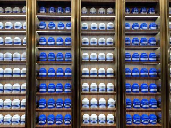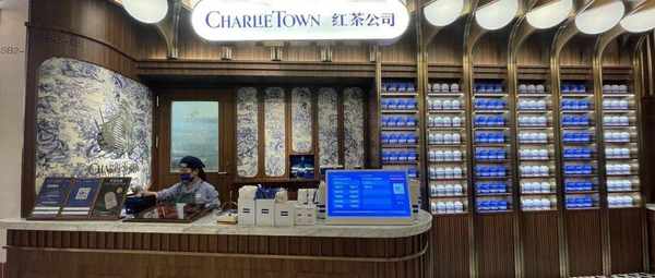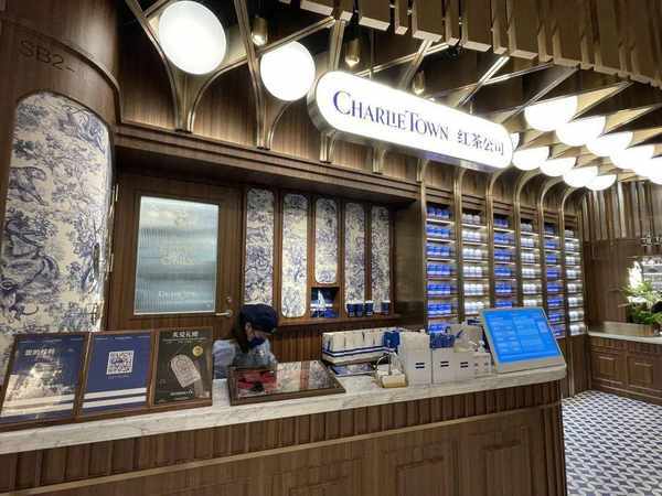这家店名叫“CharlieTown红茶公司”,开在上海的高端商场内。从外观上看,门店整体风格是英伦复古风,以原木色家具为主,装饰墙是由克莱因蓝茶罐和白色茶罐共同组成,为空间增加了明亮的现代氛围。